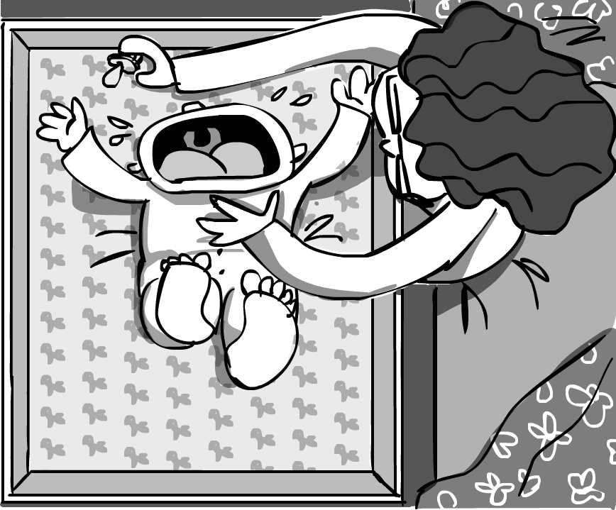 Interior. Nuestra habitación. 7.25 am. Mi reloj despertador me avisa: Llanto desgarrador de tragedia griega que interpreto como un «¡Quiero volver a comer yaaaa!«. No me lo estoy creyendo. Pero si antes aguantaba más horas. La madre que le… Que fui yo. Compruebo que no tiene pis o cacotona. Ésto último no, pero tiene un señor pis de esos que hacen que el pañal pese un quintal. Se lo cambio, a ver si sequito se relaja y se duerme de nuevo… Pero not, el gordo ya está con los ojos como platos esperando que le haga mucho mucho caso, canciones chorras incluidas. Como un pequeño bipolar sonríe y llora, sonríe y llora.