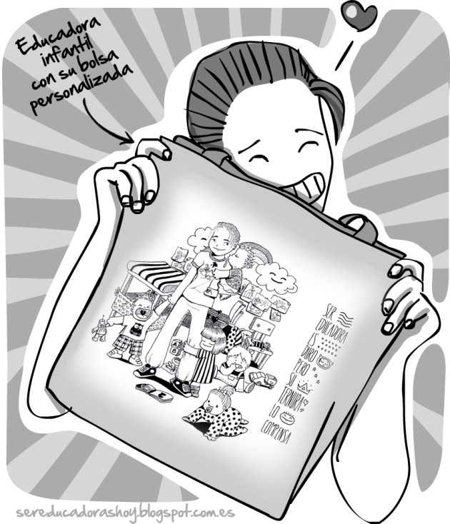 El caso es que ella me encargó una ilustración de ella misma ejerciendo de profe rodeada de criaturitas en diferentes poses y actitudes, véase el crío llorando, el que se hurga la nariz, la que gatea a su bola, el apéndice de la pierna de la profe, etc.. en el marco incomparable de una clase con todo su caos y algarabía, para estampar en una bolsa. He de decir que me lo pasé teta dibujándolo.