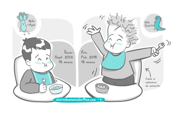 Sus arrebatos se manifiestan de diferentes formas, desde graznidos de urraca (os juro que suena como una urraca o un grajo, un grito seco y agudo, molesto quiticagas en cualquier caso), hasta lanzar la comida por los aires pasando por la típica sentada «hippie« de «no-no-moverán» y cabezazos contra paredes y/o cosas.