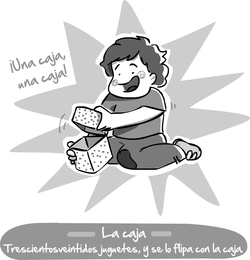 Ah! y la caja en sí, por supuesto… A veces puedo rescatar alguna y llenarla de cositas de cuando Óscar era una ratilla (manoplitas, gorritos, etc.) pero por lo general el gordo me las confisca y se pasa horas rellenándolas. Y para muestra, un botón 😉