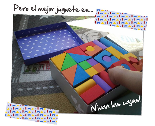 Ah! y la caja en sí, por supuesto… A veces puedo rescatar alguna y llenarla de cositas de cuando Óscar era una ratilla (manoplitas, gorritos, etc.) pero por lo general el gordo me las confisca y se pasa horas rellenándolas. Y para muestra, un botón 😉