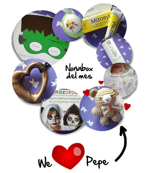 De todas las cositas chulimolonas que trae nuestra cajita Nonabox, sin duda Pepe es nuestro preferido. Más mío que de nadie, porque, entre vosotros y yo, me lo he agenciao, es tan chiquitico y tan rebonico él… Es más tierno que la primera rebanada de Pan Bimbo.31_octubre_nonabox_Además del broche de Pepito, nuestra Nonabox también viene con una careta superchula que voy a agenciar al pitufo mañana para el cole (sí, soy una malamadre, y me ha pillao el toro); unas pinturas para la cara terroríficas; una cremita pal culete Mitosol; un bote generoso de aceite de coco Miraur con el que pretendo chantajear al marío, masaje mediante (risa maligna: Muaaahahaha) para conseguir cosas; un colgante para el gordo lo roa a gusto, un chupete de la abeja Maya que me ha teletransportado a mi infancia, bocata chorizo y lata Trinaranjus en mano; y un baberito monérrimo.