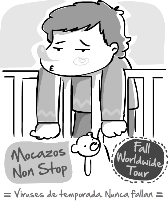 El peque, angelico mio, estaba condenado. Sin escapatoria, fue recibiendo, sin querer, resquicios de semejante carga vírica. Primero empezó con toses rarunas, que me recordaron vivamente (y acojonada también) a las cacofonías del Palacio de Liria. Y después se echaba ristras de estornudos seguidas, regándolo todo de los Sres. Viruses que ya acampaban de buen rollo en la casa, con fiestuquis locas y todo, lo mismitico que si estuvieran en el festival de Benicassim, solo que en Oskilandia.